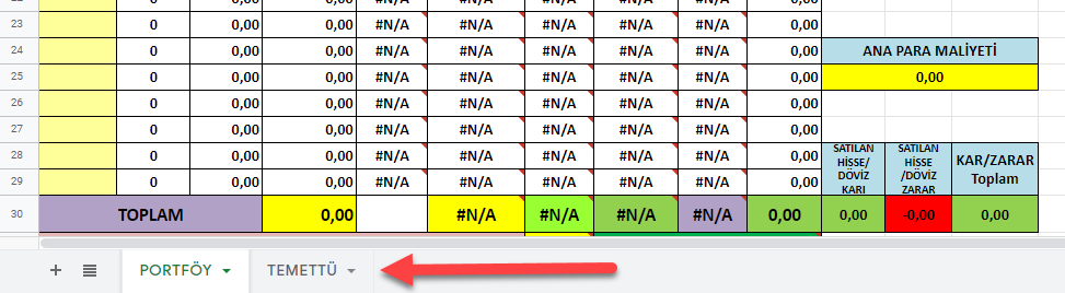 Birde burada ok ile işaretlemediğim ALINAN TEMETTÜ kısmı var TEMETTÜ sayfamızda girdiğimiz verileri otomatik yıl yıl toplayarak buraya getiriyor yazının devamında bu sayfayı da sizlere anlatmaya çalışacağım.