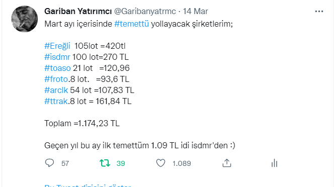 Bu ay 6 farklı şirketimden toplamda 1.174,25 TL temettü almış oldum geldiği gibi direkt yatırım hesabıma geçiyor onu hiç kullanmıyorum ve defterimde de gelir olarak göstermiyorum yatırım hesabımda aktifleşiyor geçen yıl bu ay 1 lotuma karşılık 1.09 TL İsdmr’den ilk temettümü almıştım gelecek aylarda diğer şirketlerimden de temettü gelirlerim olacak .