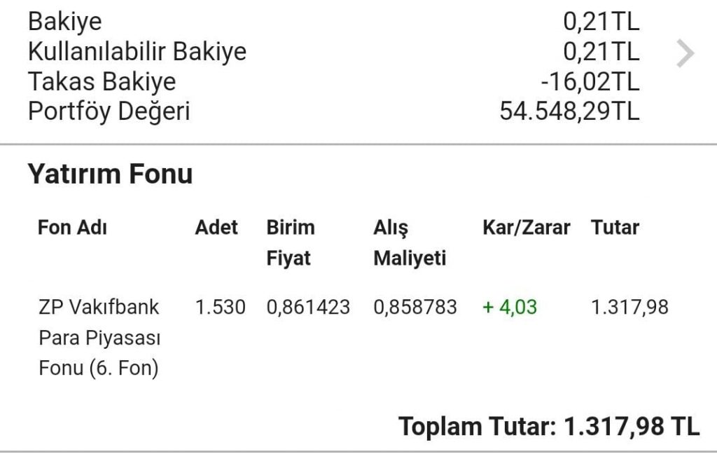 Yatırım hesabımda ki nakit durumu şu şekilde bunun içinde bu ay gelen temettülerim var ve her sabah attığım 10-20 TL ler burada birikiyor para piyasası fonunda kendisi otomatik olarak gecelik faiz işliyor ben hisse aldığım zaman kendisi satış yapıp ödemeyi yapıyor hesaba para girişi olduğu zaman otomatik olarak kendisi fon alıp duran nakiti nemalandırıyor hiç yoktan iyidir 🙂