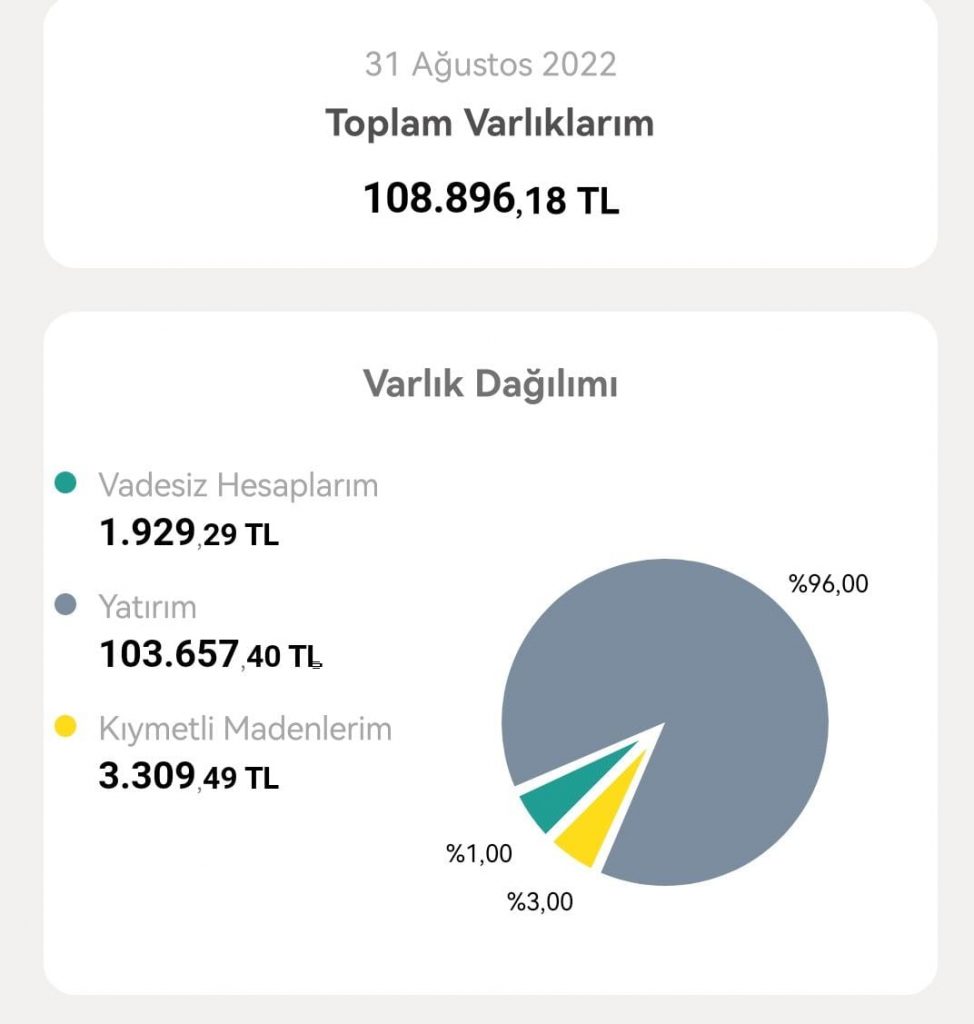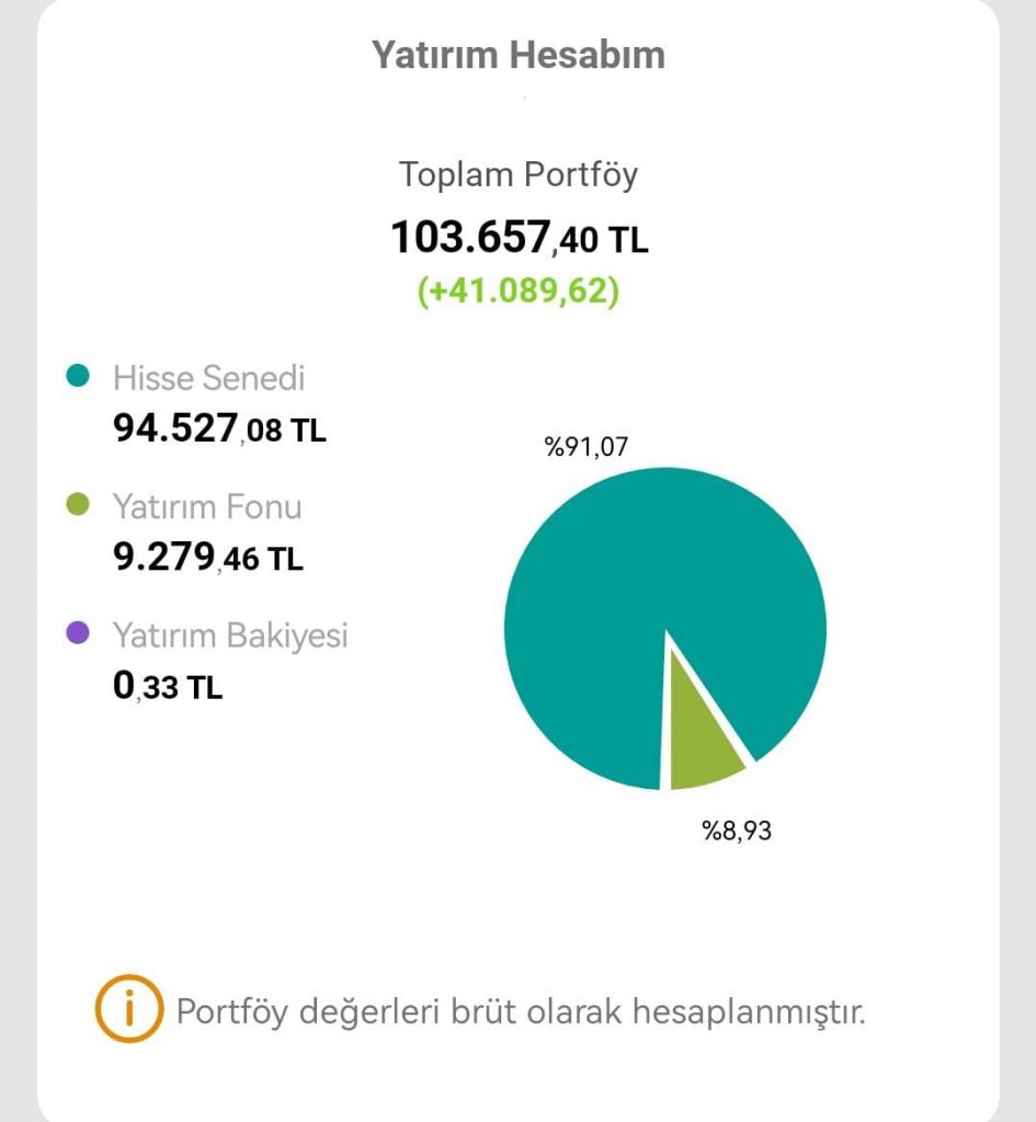 Burası da yatırım hesabım. Toplam yatırım büyüklüğü 103.657,40 TL. Buraya aktardığım paralar benim uzun vade de gözden çıkardığım asla dokunma niyetimin olmadığı paralar. Sadece fon kısmına dokunabilirim fonları bir nevi yedek akçe ve hedge mekanizması olarak görüyorum.