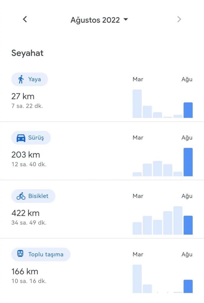 17 Şubat 2022 gününden beri mümkün olduğunca işe bisiklet ile gidip gelmeye çalışıyorum. Aşağıdaki Google haritaların istatistiklerine göre bu ay 422 km bisiklet kullanmışım. Bu ay bisikletimin şambiyelinde sorun olduğu için bir hafta kadar toplu taşıma ve araç kullandım. Ulaşıma 112 TL harcama yaptım.
