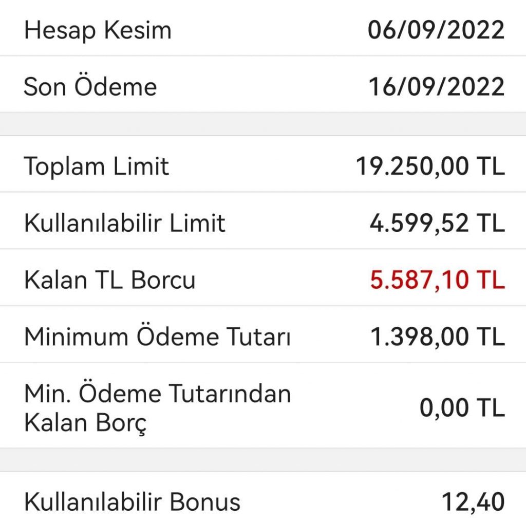 Sonra gelelim kredi kartına, karta olan borcum epey yüksek. Aylık tamamını ödeyemiyorum faiz ödemek pahasına asgari tutarı ödüyorum mecburen elime nakit geçti ama onu da tutup yatırmak içimden gelmedi daha doğrusu. Bende elime geçen paralar ile yatırım yaptım. Yaptığım yatırımları finansal yatırım durumlarımda anlatacağım. Kredi kartının asgarisi 1.398 TL imiş.