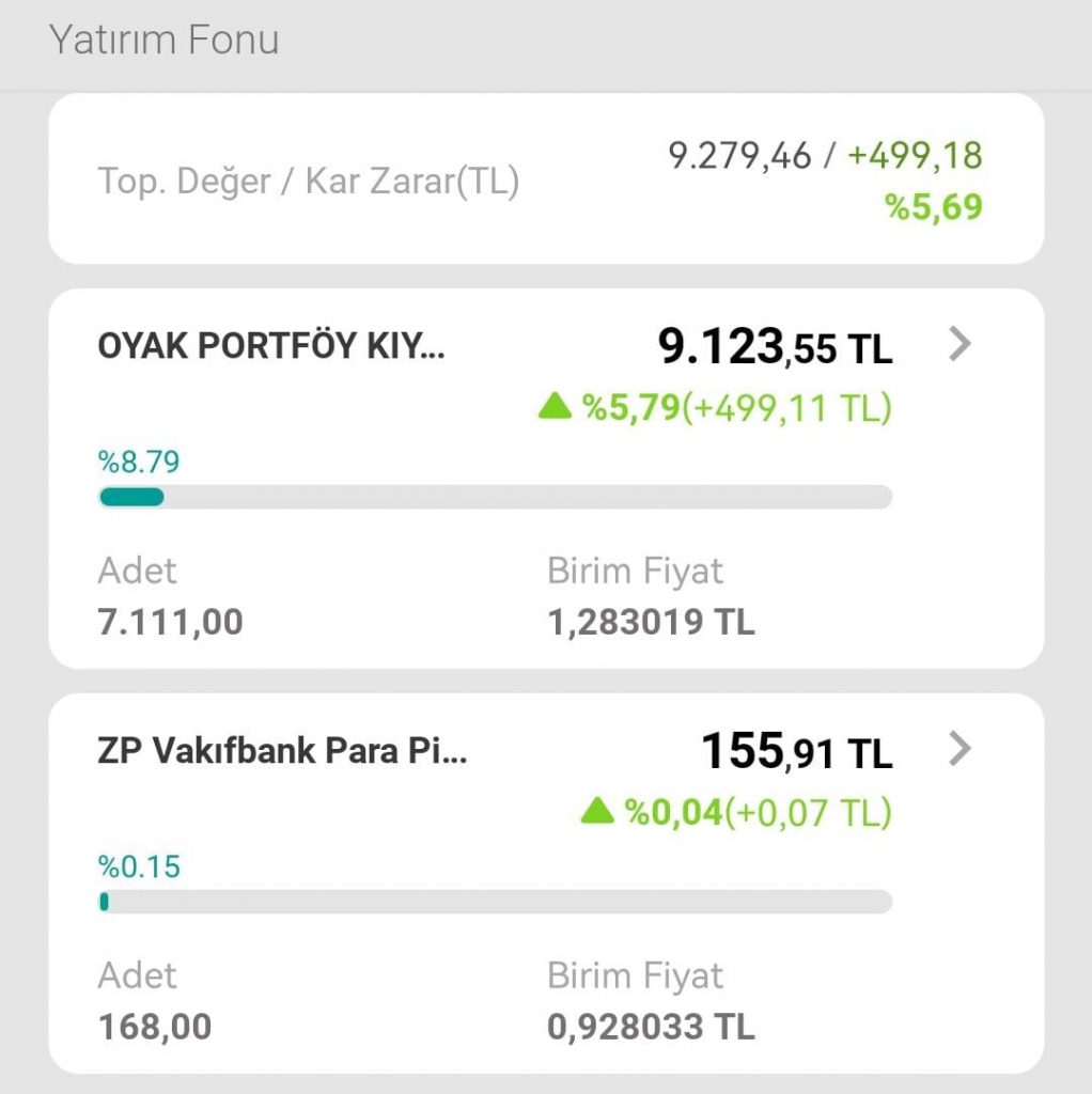 Onun dışında aşağıdaki 155,91 lira olan ise para piyasası fonu, ben yatırım hesabıma aktardığım TL nakdi burada tutarım, burası benim yatırım havuzum dur. Gelen temettüler otomatik olarak buraya yatar. Benim vadesiz mevduat hesabımdan virmanladığım yatırım için aktardığım nakitler otomatik olarak bu fon tarafından alınır. Hisse alımlarında ise otomatik olarak fon kendisi gerekli hisse ödemesini yapar. Bu sistemi seviyorum. Para atıl vaziyette durmaktansa çok düşükte olsa gecelik repo faizi elde ediyor. O elde edilen faizleri de aylık bir iki lot Vesbe alımlarında kullanıyorum.