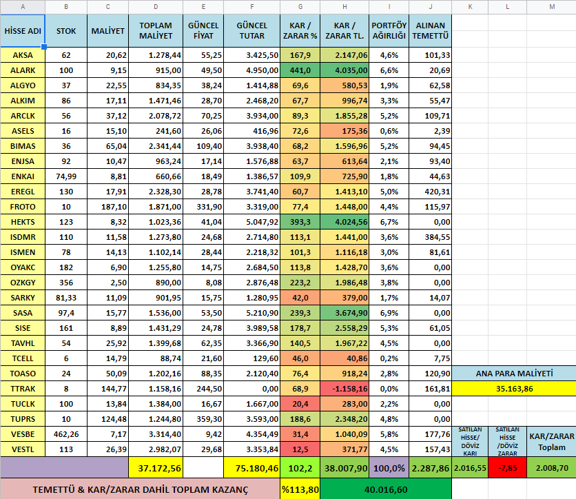 Not: Nacizane bir tavsiyem portföyündeki hisse sayısı çok fazla. Biraz azaltman yararına olacaktır. Ben 6 hisse ile başladım. Portföy büyüyünce 10’a çıkarıp o şekilde devam etmeyi planlıyorum. Sermaye başta kısıtlı olduğu için fazla bölmemekte fayda var.