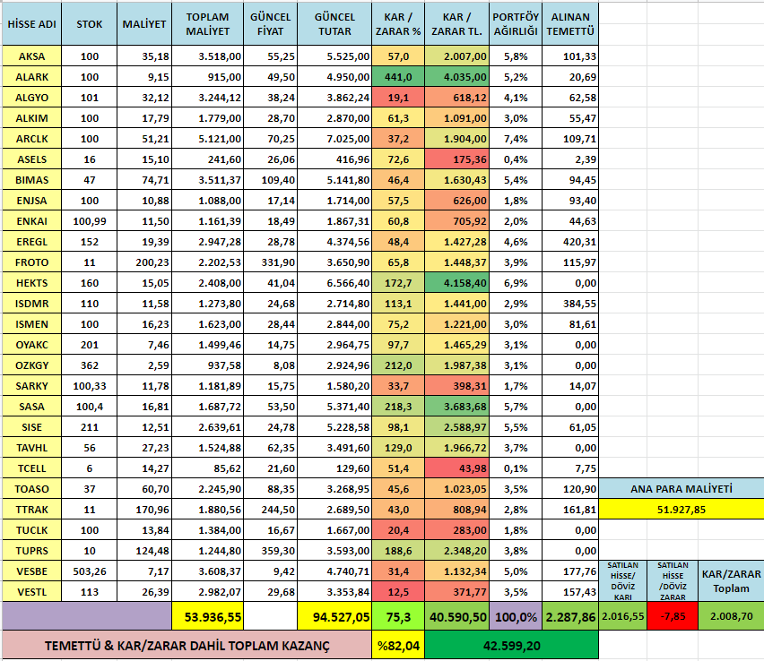 Evet, bu ay yukarıda sıraladığım hisse alımlarını gerçekleştirdim. Toplamda bu ay hisse portföyüne eklediğim tutar 16.556,74 TL. Geçen ay ki portföy değerinin üzerine bu ay ki yatırım yaptığım tutarı eklersem ve borsada hiç değer artışı olmadığını düşünmüş olsam portföyün durumu 83.797,69 TL olması gerekirdi. Hisselerimdeki değer artışları ile birlikte güncel hisse portföyü değeri 94.527,08 TL, 10.729,39 TL‘lik bir değer artışı söz konusu. Aşağıya bir de geçen ay ki portföyüme hiç dokunmasaydım ne durumda olurdu diye düşünerek excel tablosu ekleyeceğim. Şu an için portföyün getirisi %75,3 civarında ana paraya göre ise %82,04 civarında.