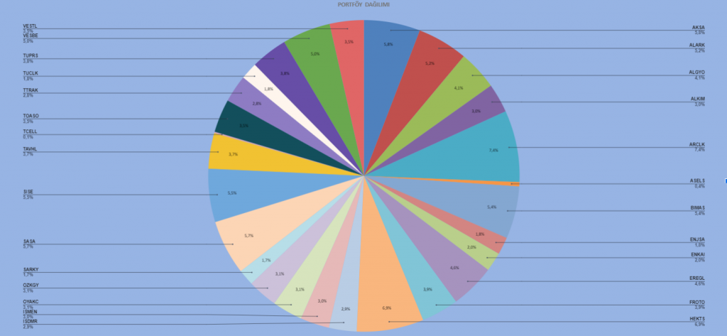 Yatırım hesabımın dağılımında ağırlığı %91,07 ile Borsa İstanbul’daki hisse senedi yatırımlarım oluşturuyor. %8,93 ise OTJ kıymetli madenler yatırım fonundan oluşuyor. Bu ay yatırım hesabına toplam 18.182,17 TL yatırım yaptım. Bu tutarın 1.625,43 TL‘sini OTJ fonuna aktardım geri kalan tutarın hepsini hisse senedi portföyüme dağıttım detayları aşağıda anlatacağım.