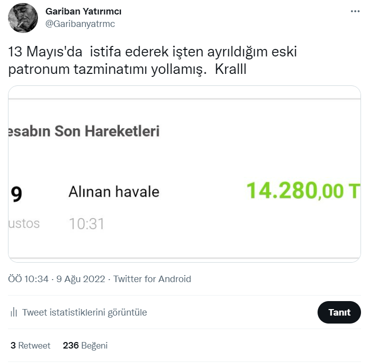 Bu 25.840,15 TL‘nin büyük kısmını eski patrondan almayı beklediğim iki buçuk yıllık tazminatım ve izin paralarım oluşturuyor. Bu ayın dokuzun da eski patron hesabıma parayı yatırdı.