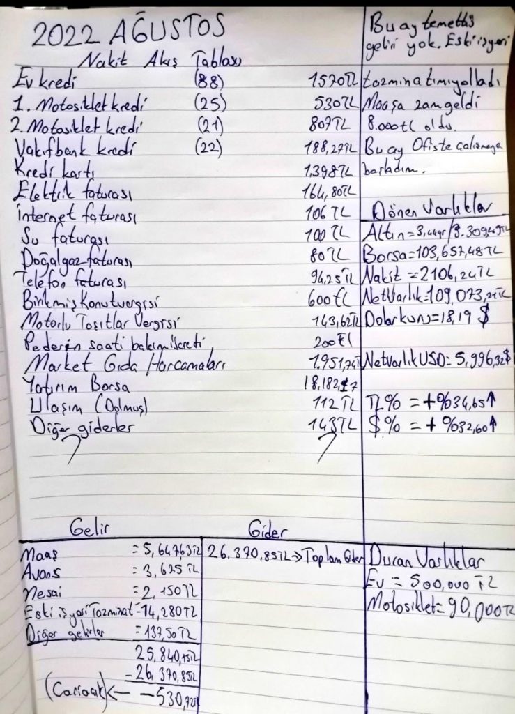 Bu harcama kalemlerini tek tek toplayıp kategorilerine ayırdığım el yazısı ile yazdığım Nakit Akış Tablosunu ekleyeceğim hemen alt tarafa orada ayrıca anlatacağım, geçelim hemen;