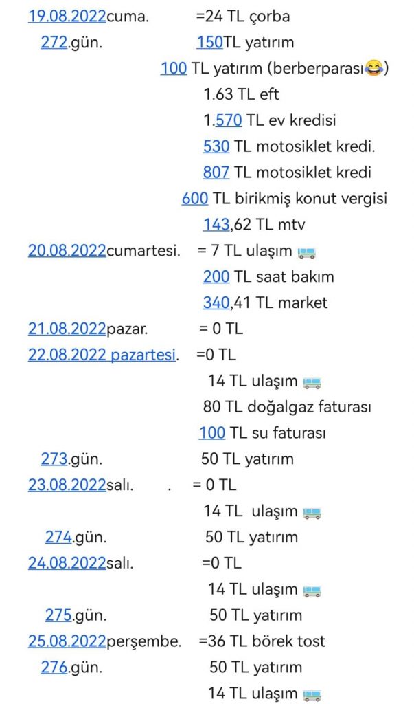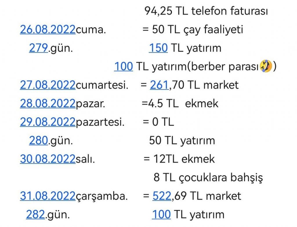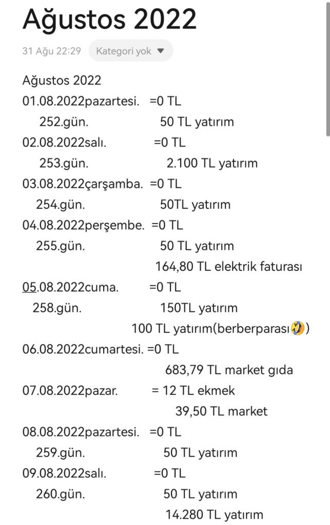 Burası benim günlük bütün harcama kalemlerimi takip ettiğim not defteri. Bu şekilde not tutmayı tam 2019 Haziran ayından beri yapıyorum. 2018 Kasım ayında deftere yazmaya başlamıştım daha sonra 2019 Haziran ayında uzun bir tatile çıkınca telefona yazmak zorunda kalınca böyle bir alışkanlık edinmiş oldum. Ama memnunum severek yapıyorum çok faydasını görüyorum.