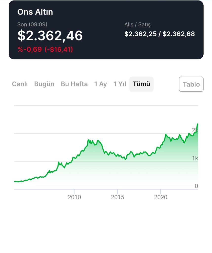 1 ons altının gördüğüm kadarıyla son fiyatı 2.362,46 USD.